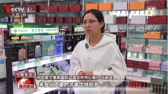 中哈霍尔果斯国际边境合作中心商户马丽亚:国庆假期进入了旅游高峰期,来我们店里的游客也特别多,我们也在不停上货、备货,销售额比平时增长了30%。