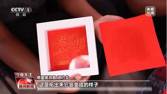 喀麦隆游客迪约戈:这个是我正在做的,拓印发财被爱四个字,这是拓出来以后的样子,我一直对中国的文化很感兴趣,通过这个我可以学到更多中国的文化。