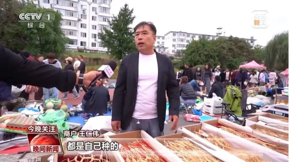 商户王仁伟:是自己的一手货源,像是茄子、辣椒、桃子都是自己生产的,自己上市场去卖。
