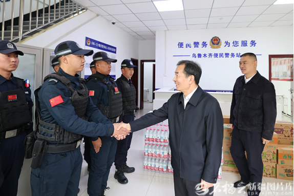 10月5日,自治区党委书记、兵团党委第一书记、第一政委陈小江在乌鲁木齐市公安局二道桥街道派出所,看望慰问基层政法干警,向节日期间坚守岗位的一线干部职工致以亲切问候。石榴云/新疆日报记者崔志坚摄