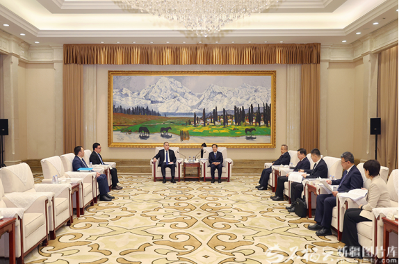 11月5日,自治区党委书记陈小江、自治区主席艾尔肯·吐尼亚孜在乌鲁木齐会见哈萨克斯坦驻华大使努雷舍夫。石榴云/新疆日报记者崔志坚摄