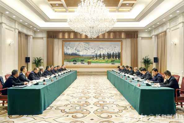 12月4日,自治区党委书记陈小江、自治区主席艾尔肯·吐尼亚孜在乌鲁木齐会见中国中铁股份有限公司董事长陈文健一行。石榴云/新疆日报记者谢龙摄