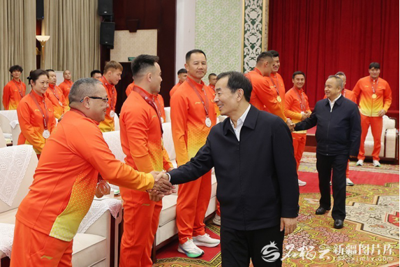 12月4日,自治区党委书记陈小江、自治区主席艾尔肯·吐尼亚孜在乌鲁木齐会见载誉归来的第十五届全国运动会新疆体育代表团获奖运动员、教练员代表。石榴云/新疆日报记者崔志坚摄
