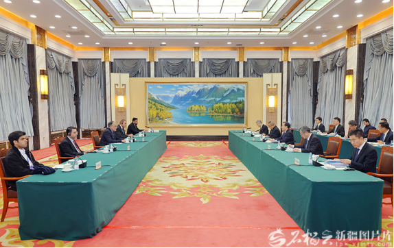 12月2日,自治区党委书记陈小江、自治区主席艾尔肯·吐尼亚孜在乌鲁木齐会见巴基斯坦规划、发展与特别倡议部部长阿赫桑·伊克巴尔。石榴云/新疆日报记者崔志坚摄