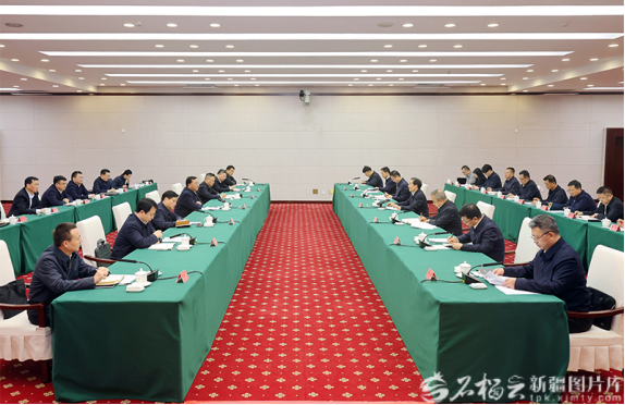 12月17日,自治区党委书记陈小江、自治区主席艾尔肯·吐尼亚孜在乌鲁木齐会见中国铁道建筑集团董事长戴和根一行。石榴云/新疆日报记者崔志坚摄
