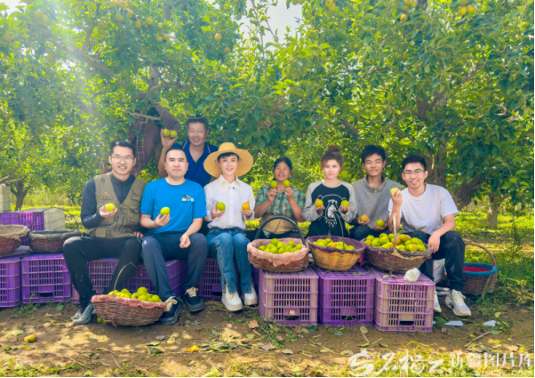 2024年9月,贺娇龙(前排左三)在库尔勒市一处香梨园和果农一起拍宣传片。资料图片