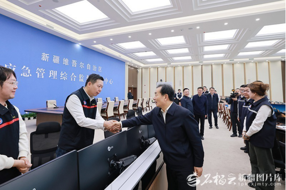 2月20日,自治区党委书记陈小江在自治区应急管理综合监测预警中心,慰问坚守岗位的干部职工,详细听取节日值班值守、应急备勤、重点领域隐患排查整治情况介绍。石榴云/新疆日报记者崔志坚摄