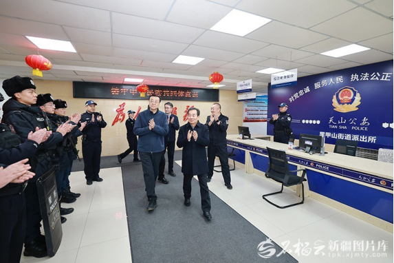 2月20日,自治区党委书记陈小江在乌鲁木齐市天山区黑甲山街道派出所,看望慰问执勤民警、辅警,详细了解节日巡防、警情处置、便民服务等工作开展情况。石榴云/新疆日报记者崔志坚摄