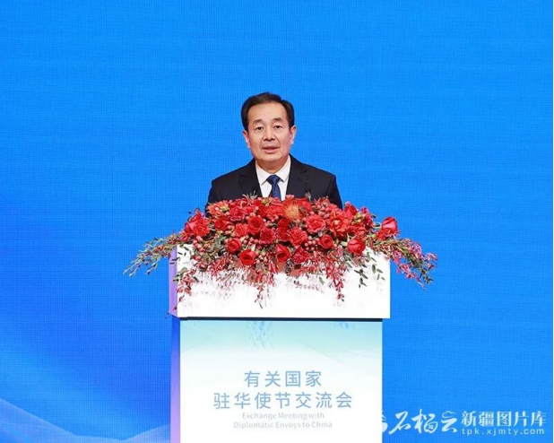 北京新疆大厦木卡姆厅洋溢着热烈友好的氛围。来自40个国家的驻华大使、外交官和有关国际组织代表出席交流会。
