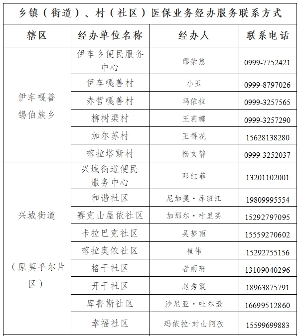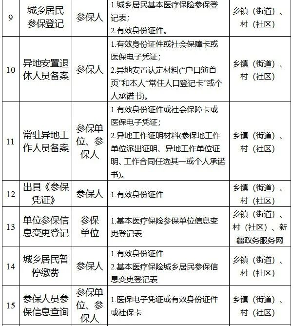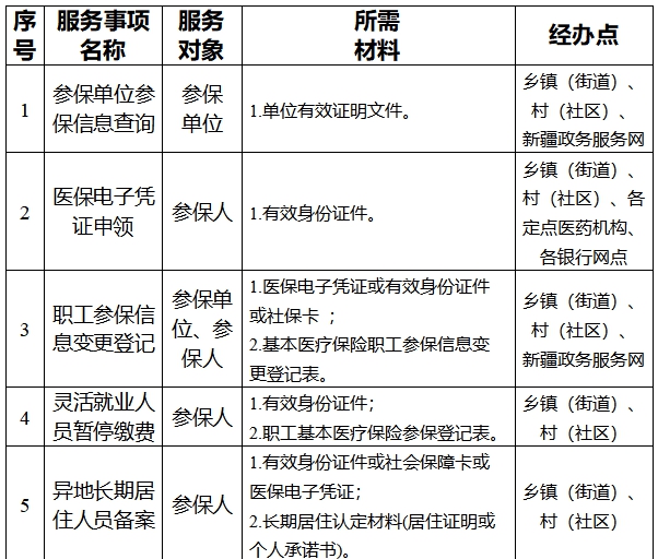 为进一步贯彻落实国家医疗保障局《关于优化医保领域便民服务的意见》文件精神,推进我市“15分钟医保服务圈”,最大限度方便各族群众就近办理医保业务,霍尔果斯市医疗保障局已将参保登记等16项医疗保障经办政务服务事项下沉各乡(街道)和村(社区),各参保单位、参保人员可就近在乡(街道)、村(社区)便民服务中心及手机APP办理相关事项,请相互转告。具体事项通告如下。