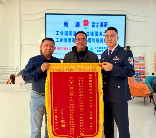 “太感谢你们了!加班加点帮我们解决难题,让这场纠纷有了圆满结果!”近日,俄罗斯客商吉克(化名)委托中方合作商将一面锦旗送到霍尔果斯市工业园区司法所。这背后不仅是一场跨越语言与文化的温情调解,更是基层法治力量护航外贸发展的生动实践。