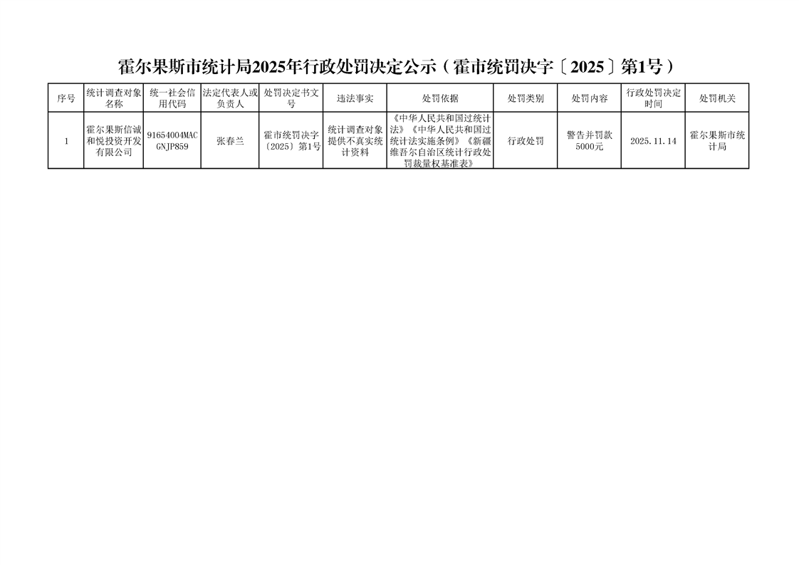 霍尔果斯市统计局2025年行政处罚决定公示(霍市统罚决字〔2025〕第1号)
