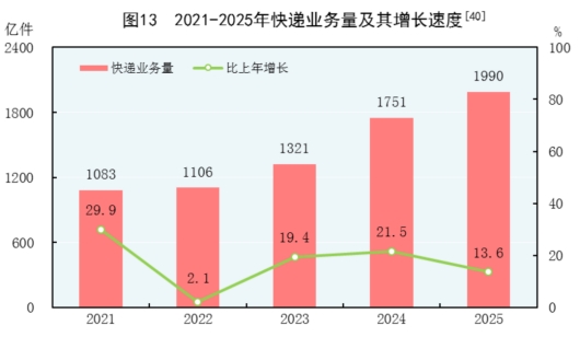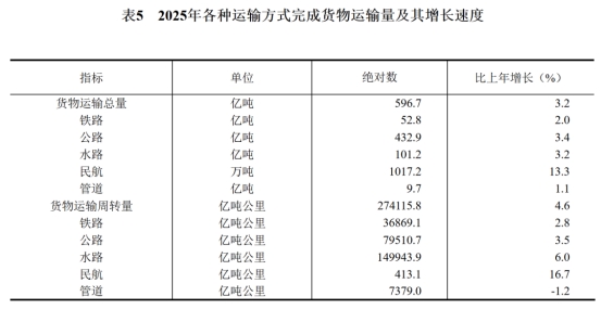 [31]货物运输总量及周转量包括铁路、公路、水路、民航和管道五种运输方式完成量,2025年增速按可比口径计算。