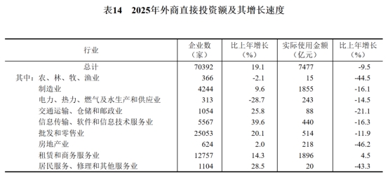 全年新设立外商投资企业70392家,比上年增长19.1%。实际使用外资金额7477亿元,下降9.5%。其中,共建“一带一路”国家(含通过部分自由港对华投资)对华新设立外商投资企业19756家,增长14.7%;对华直接投资1168亿元,增长1.9%。高技术产业实际使用外资2418亿元,下降15.6%。