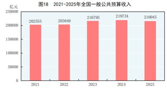 注:图中2021年至2024年数据为全国一般公共预算收入决算数,2025年为执行数。