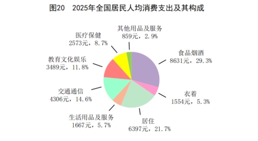 全年全国居民人均消费支出29476元,比上年增长4.4%,扣除价格因素,实际增长4.4%。其中,人均服务性消费支出[66]13602元,比上年增长4.5%,占居民人均消费支出比重为46.1%。按常住地分,城镇居民人均消费支出35869元,增长3.8%,扣除价格因素,实际增长3.7%;农村居民人均消费支出20259元,增长5.1%,扣除价格因素,实际增长5.3%。全国居民恩格尔系数为29.3%,其中城镇为28.3%,农村为31.8%。