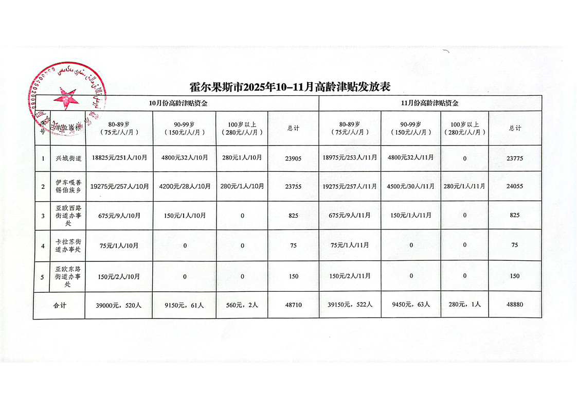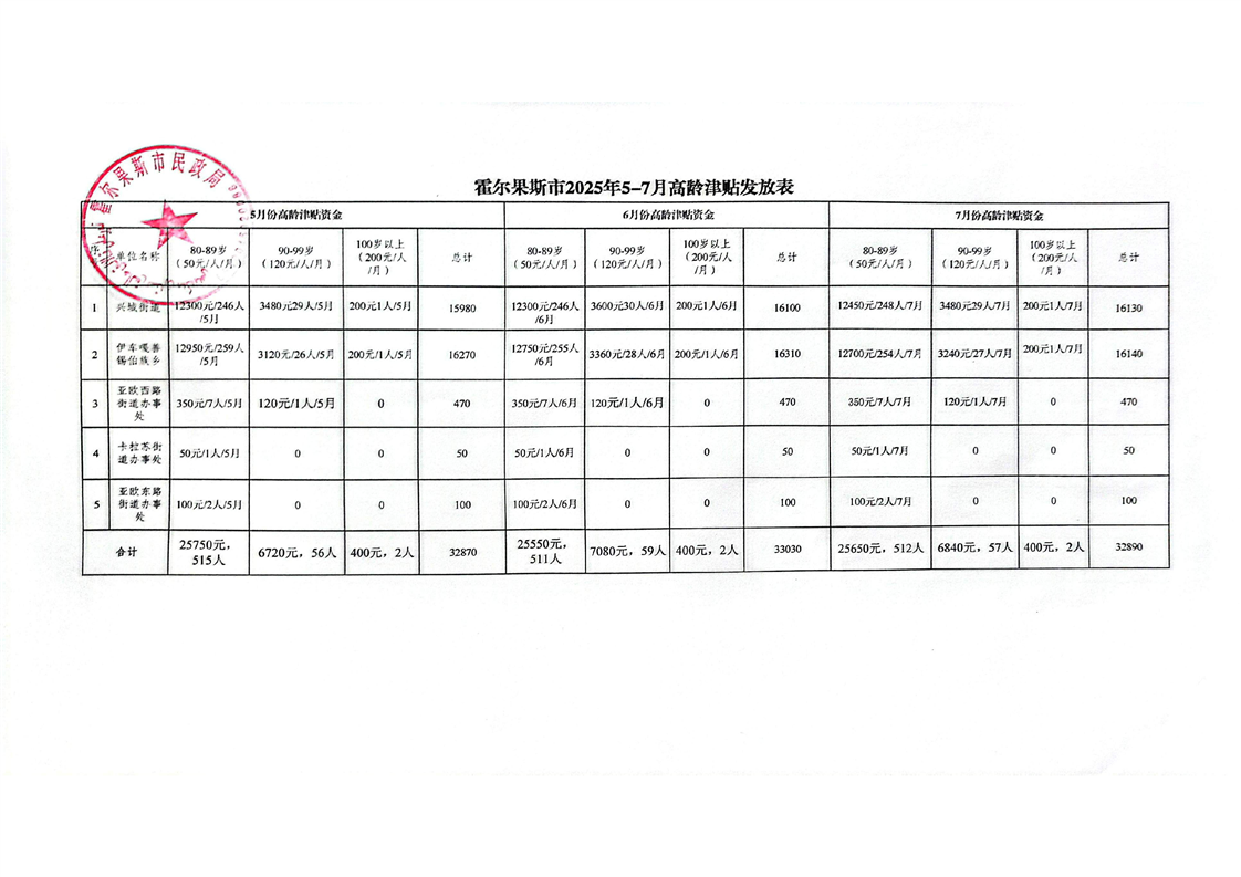 霍尔果斯市民政局2025年5月至11月高龄津贴发放表