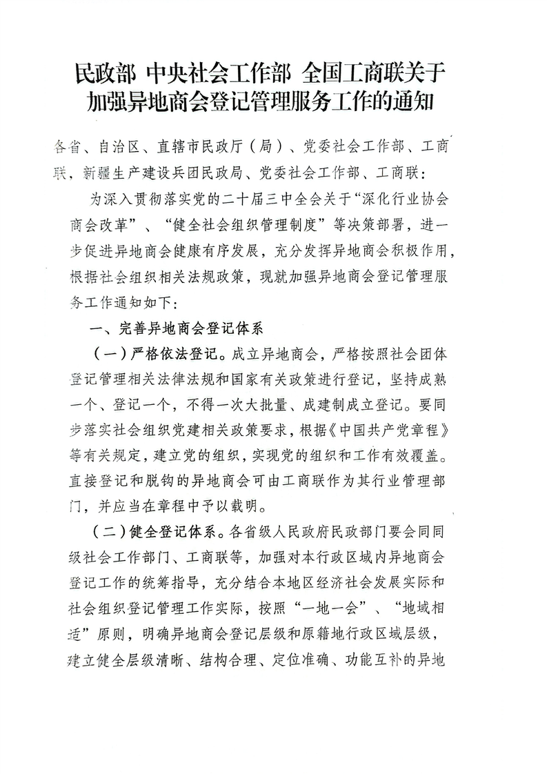 全国工商联关于加强异地商会登记管理服务工作的通知