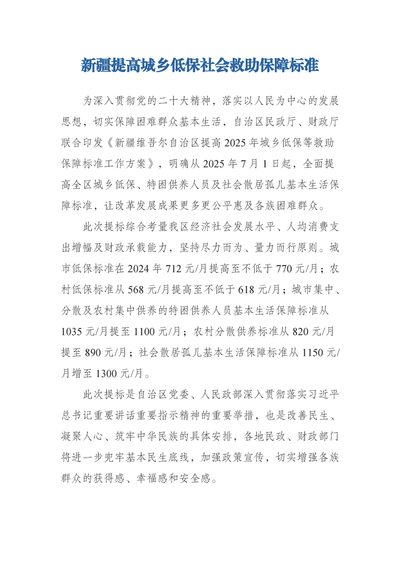 新疆提高城乡低保社会救助保障标准