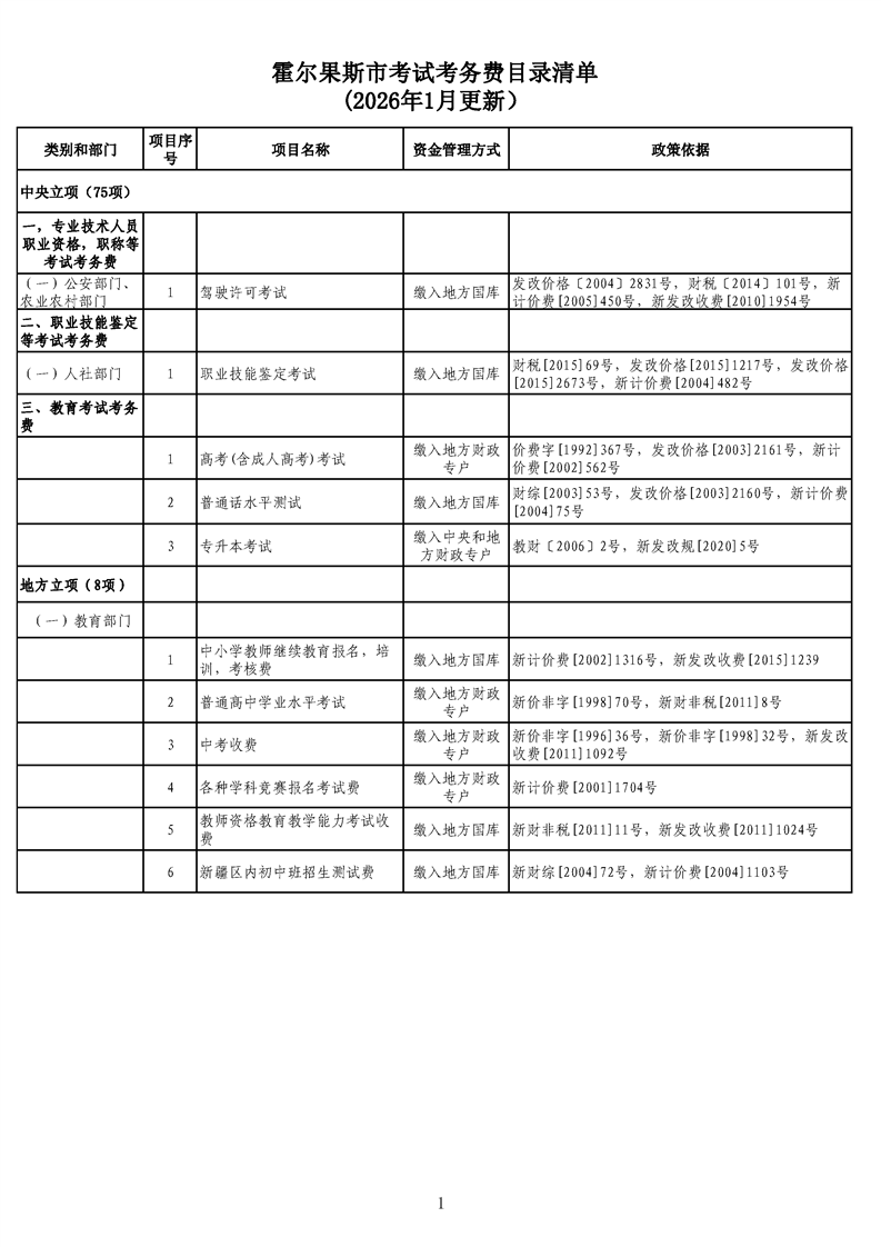 霍尔果斯市考试考务费目录清单(2026年1月更新)