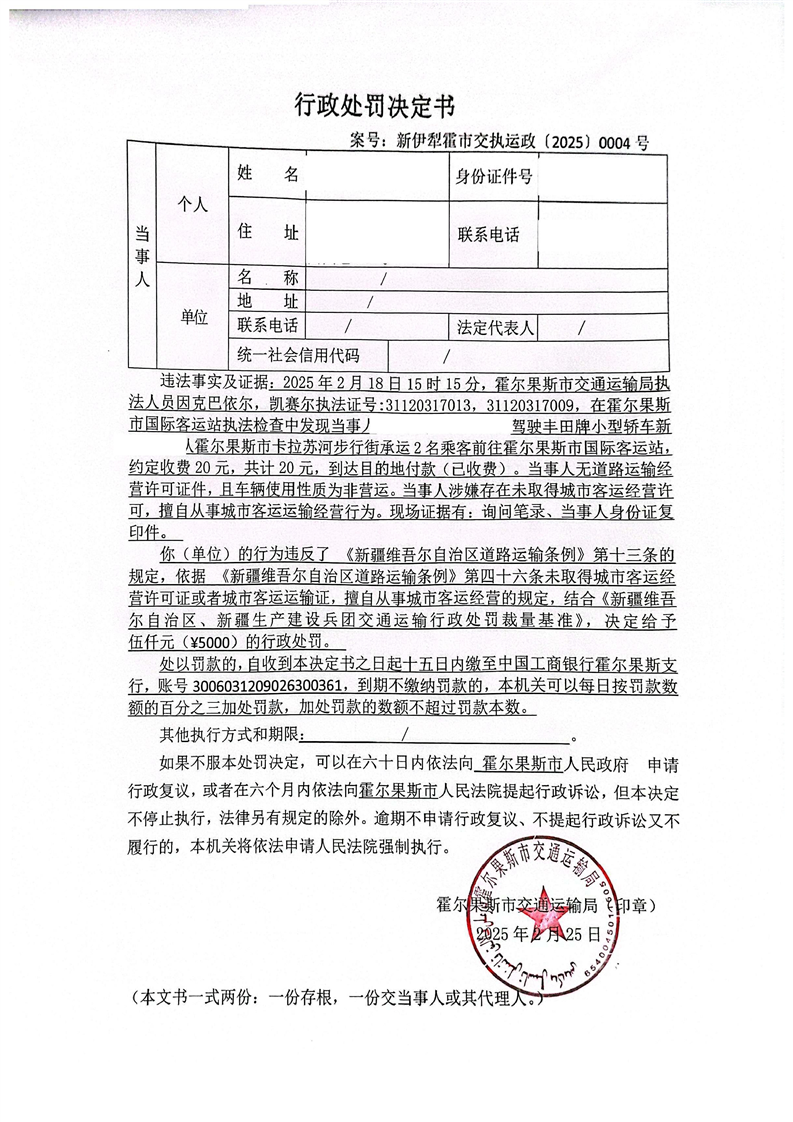 新伊犁霍市交执运政【2025】0004号