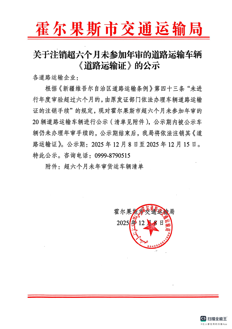 关于注销超六个月未参加年审的道路运输车辆《道路运输证》的公示