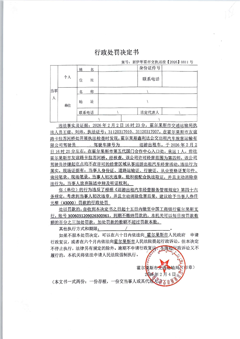 新伊犁霍市交执运政【2026】0011号行政处罚决定书