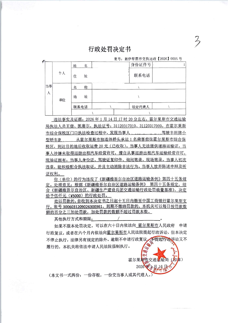 新伊犁霍市交执运政【2026】005号行政处罚决定书