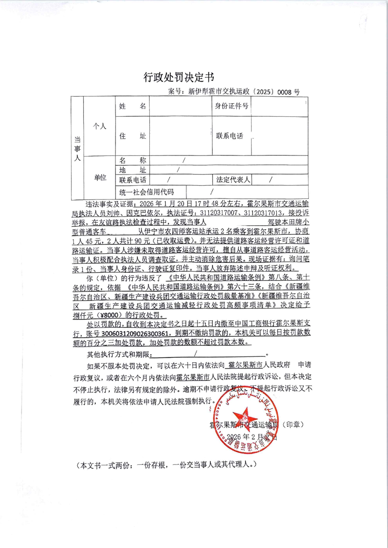新伊犁霍市交执运政【2026】008号行政处罚决定书