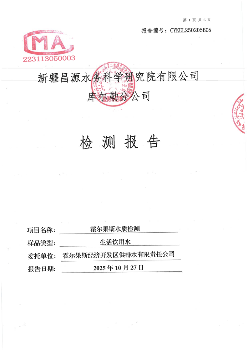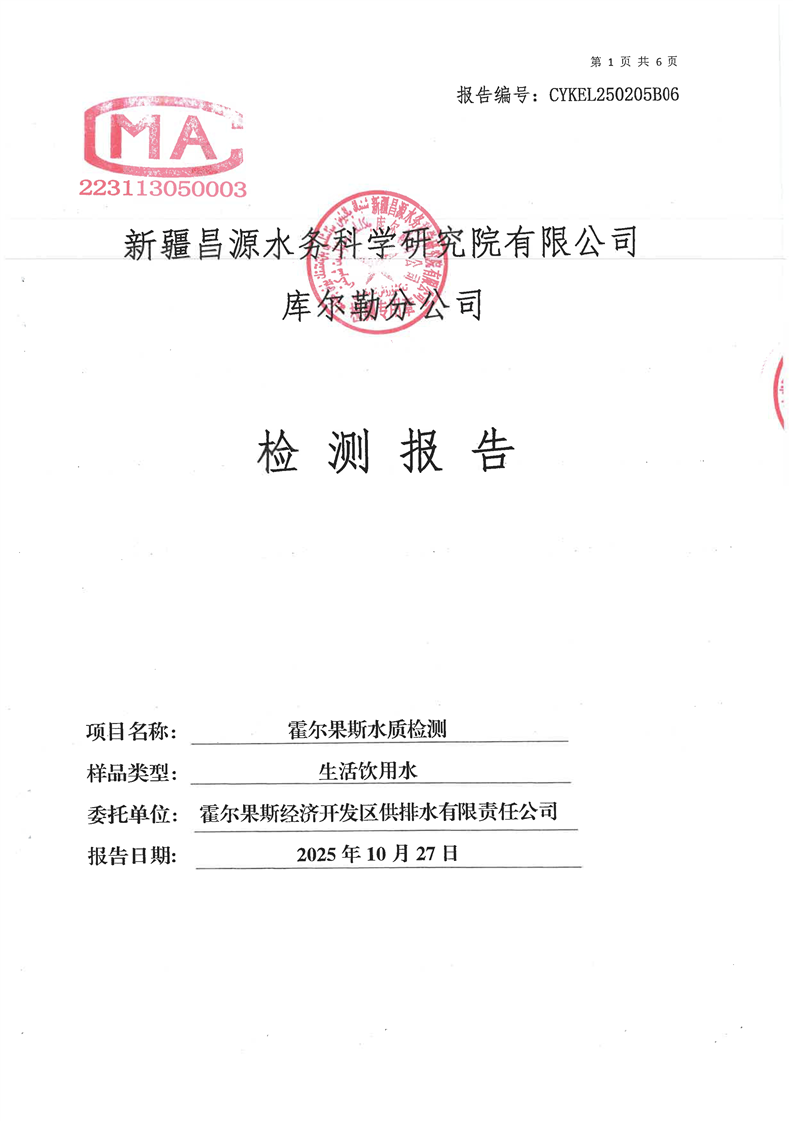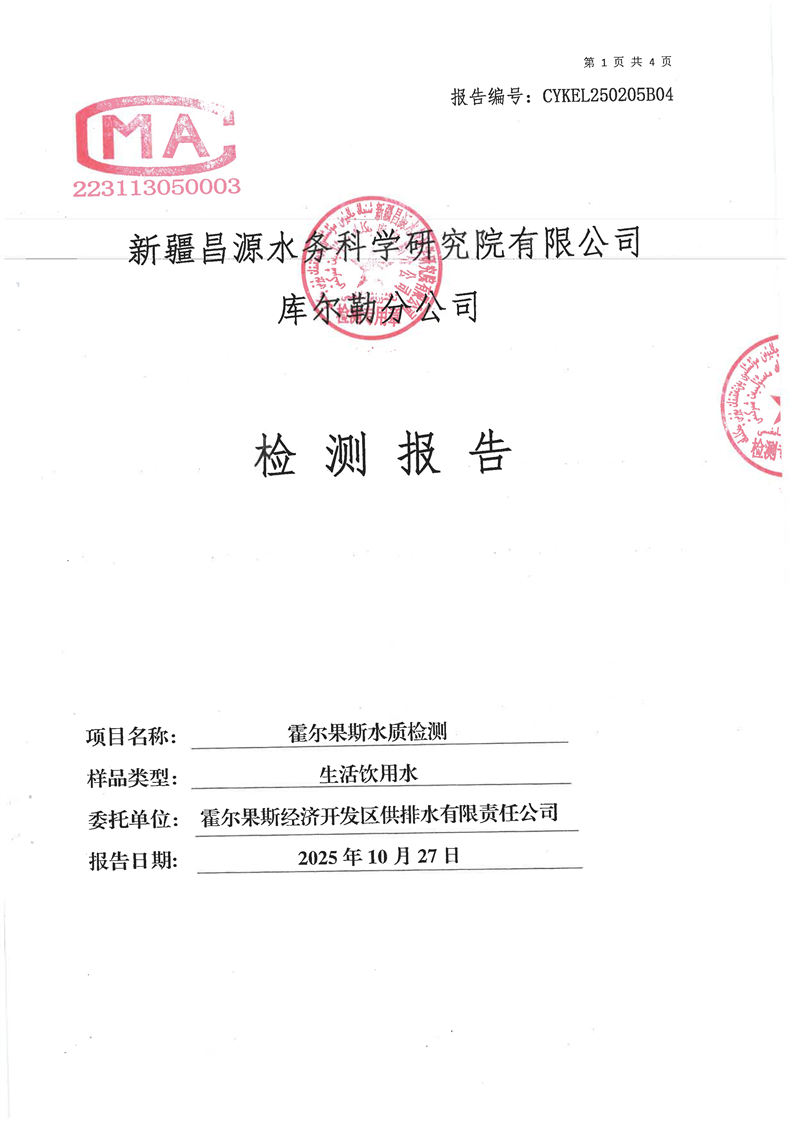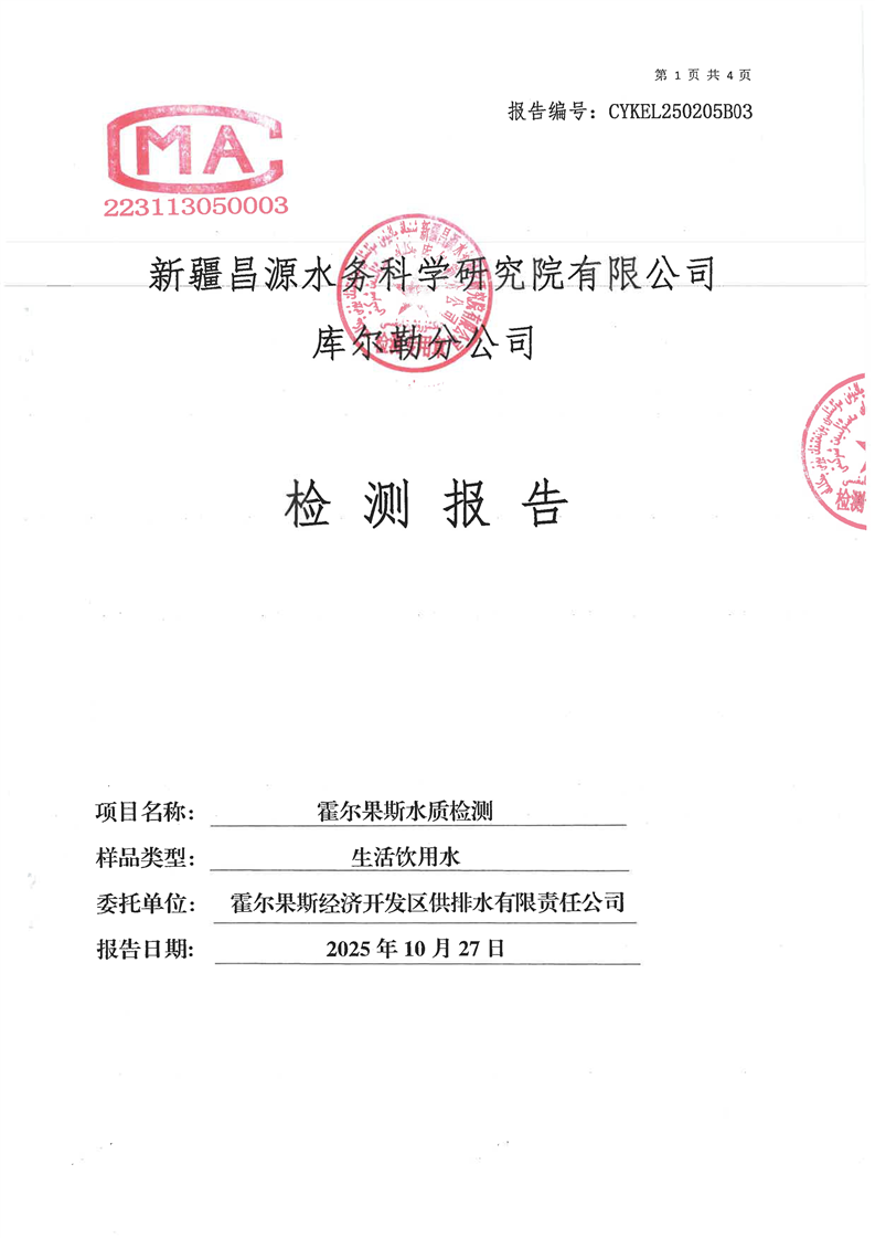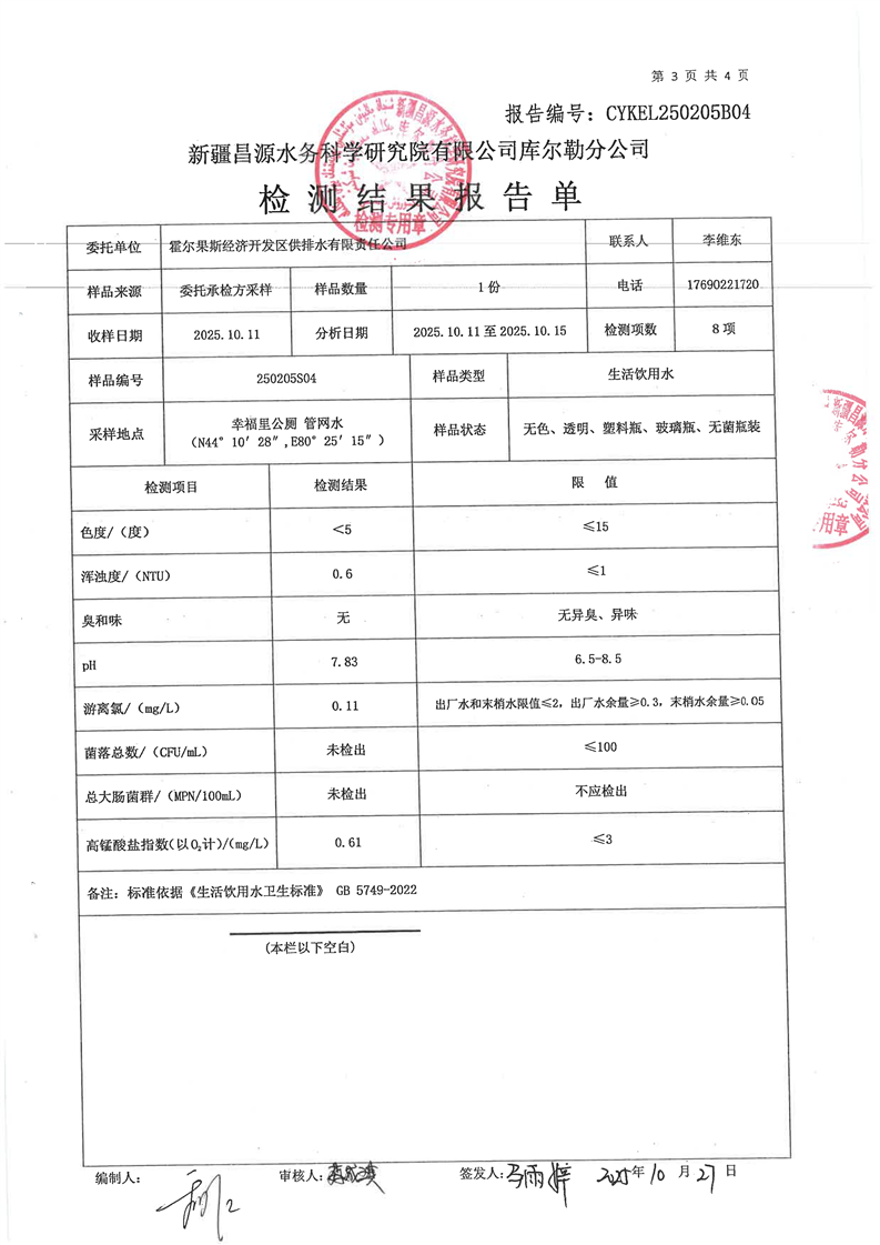 霍尔果斯市2025年10月份生活饮用水水质检测信息