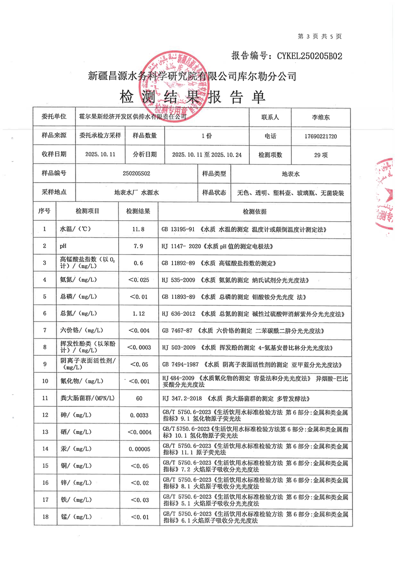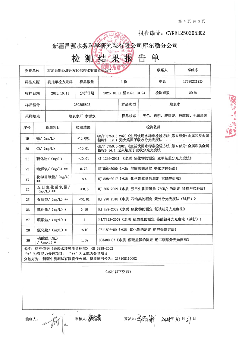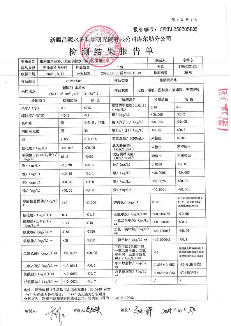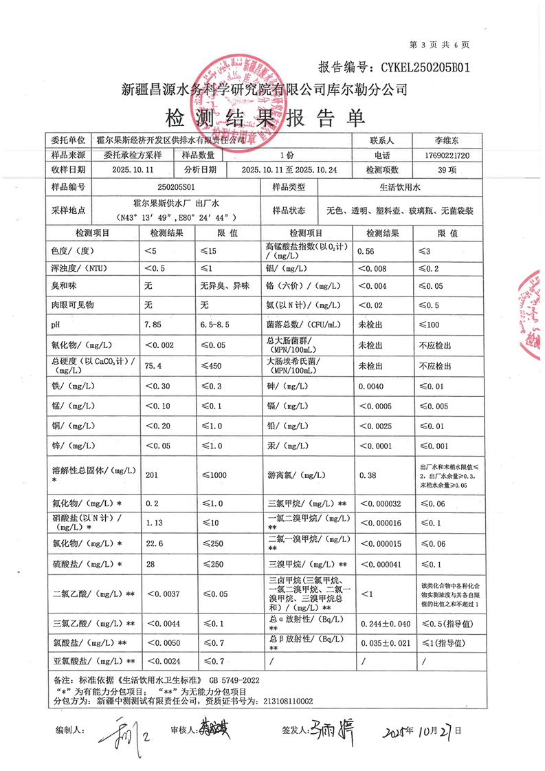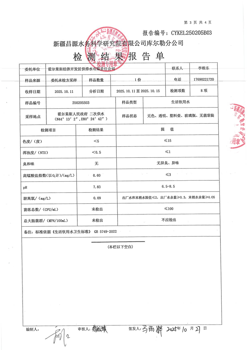 霍尔果斯市2025年10月份生活饮用水水质检测信息