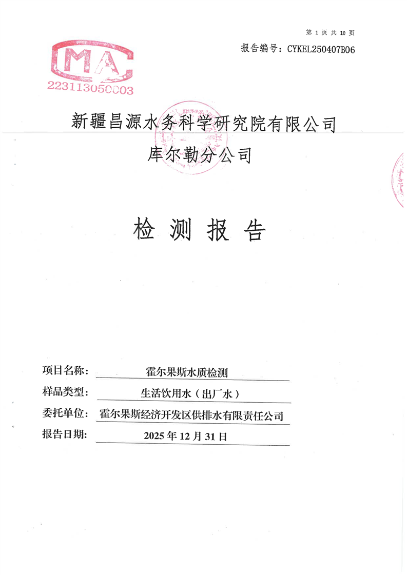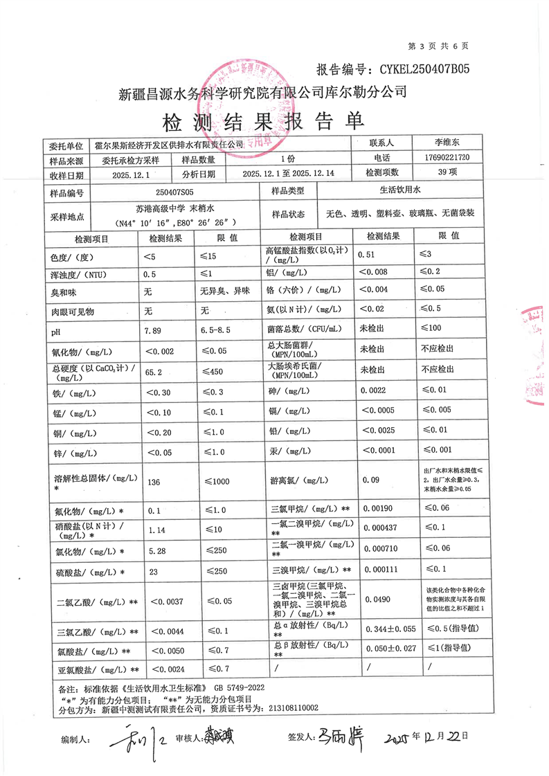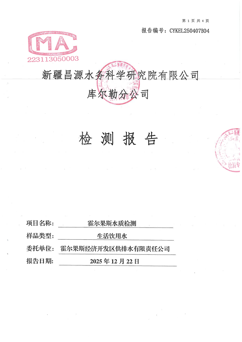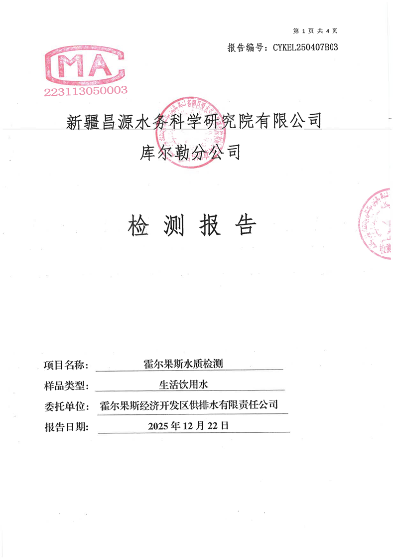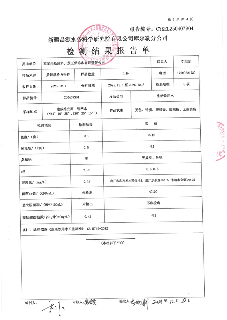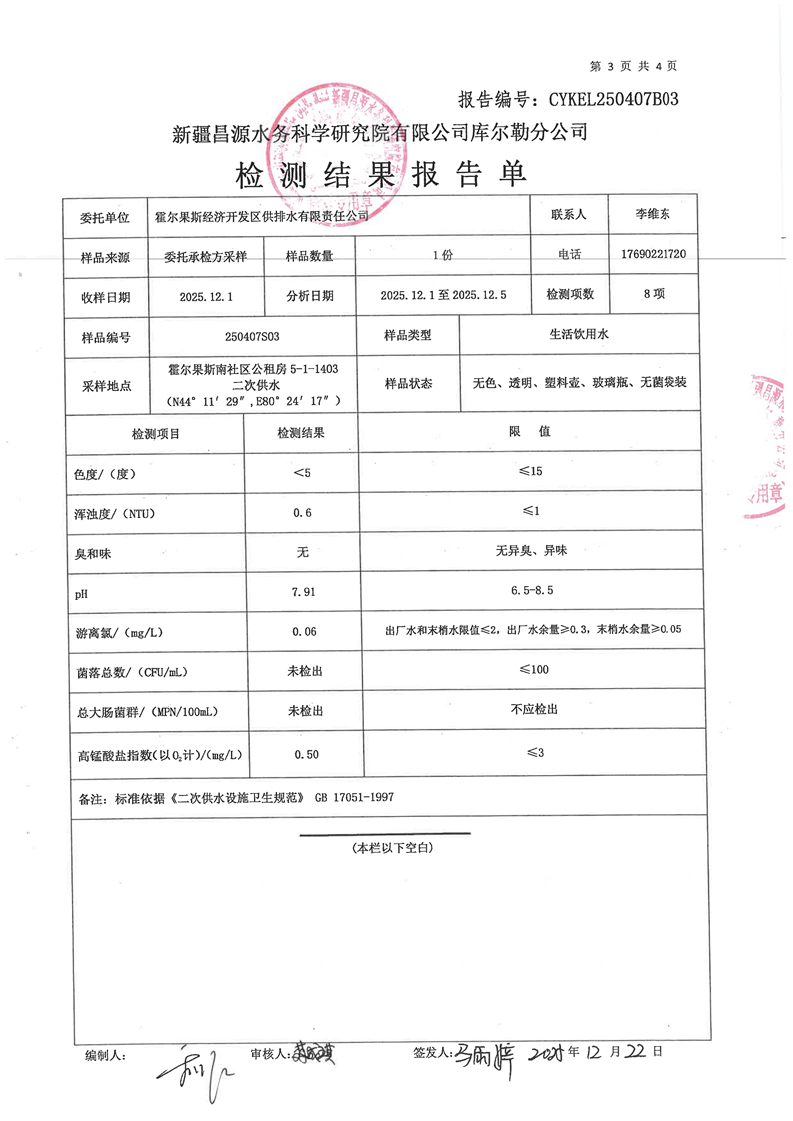 霍尔果斯市生活饮用水12月份水质检测报告