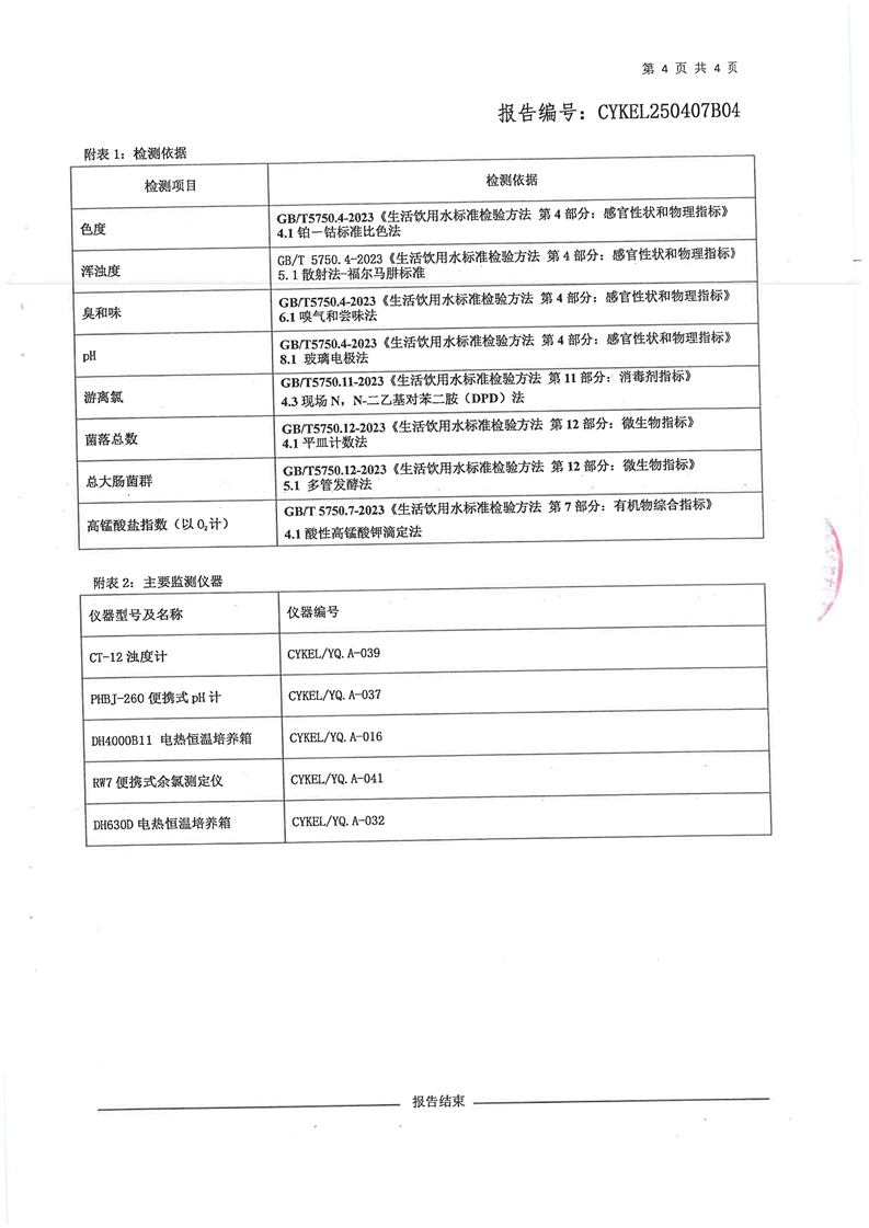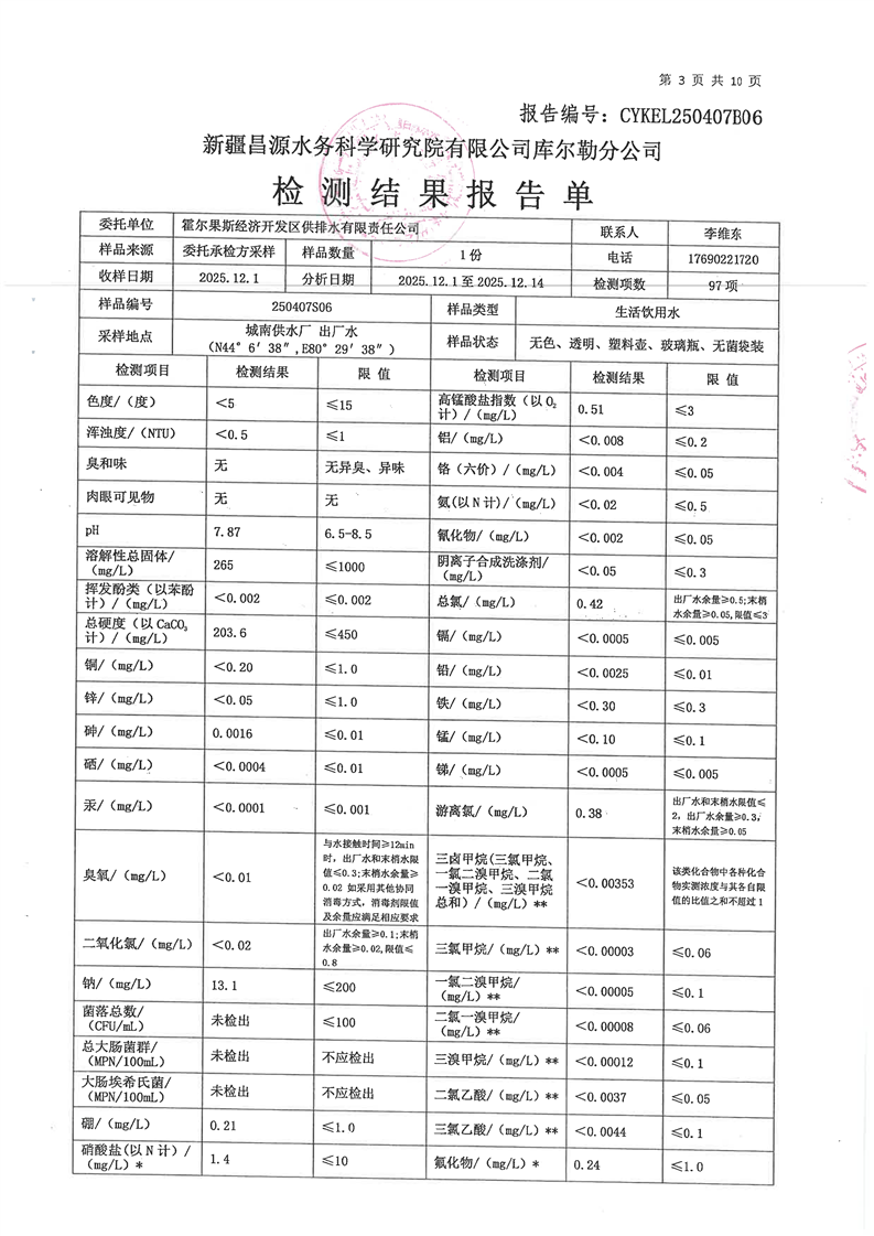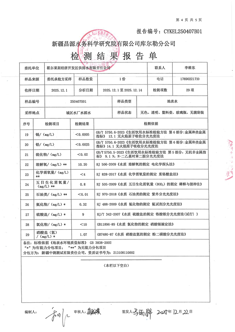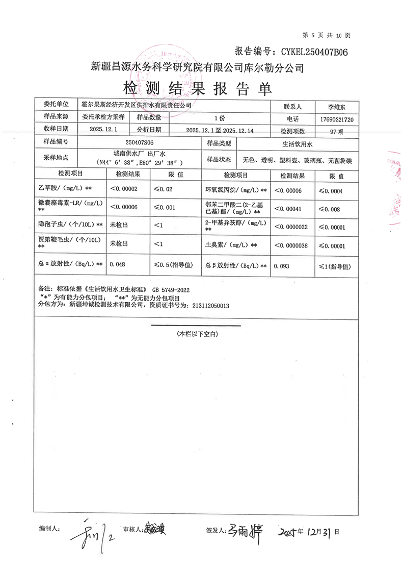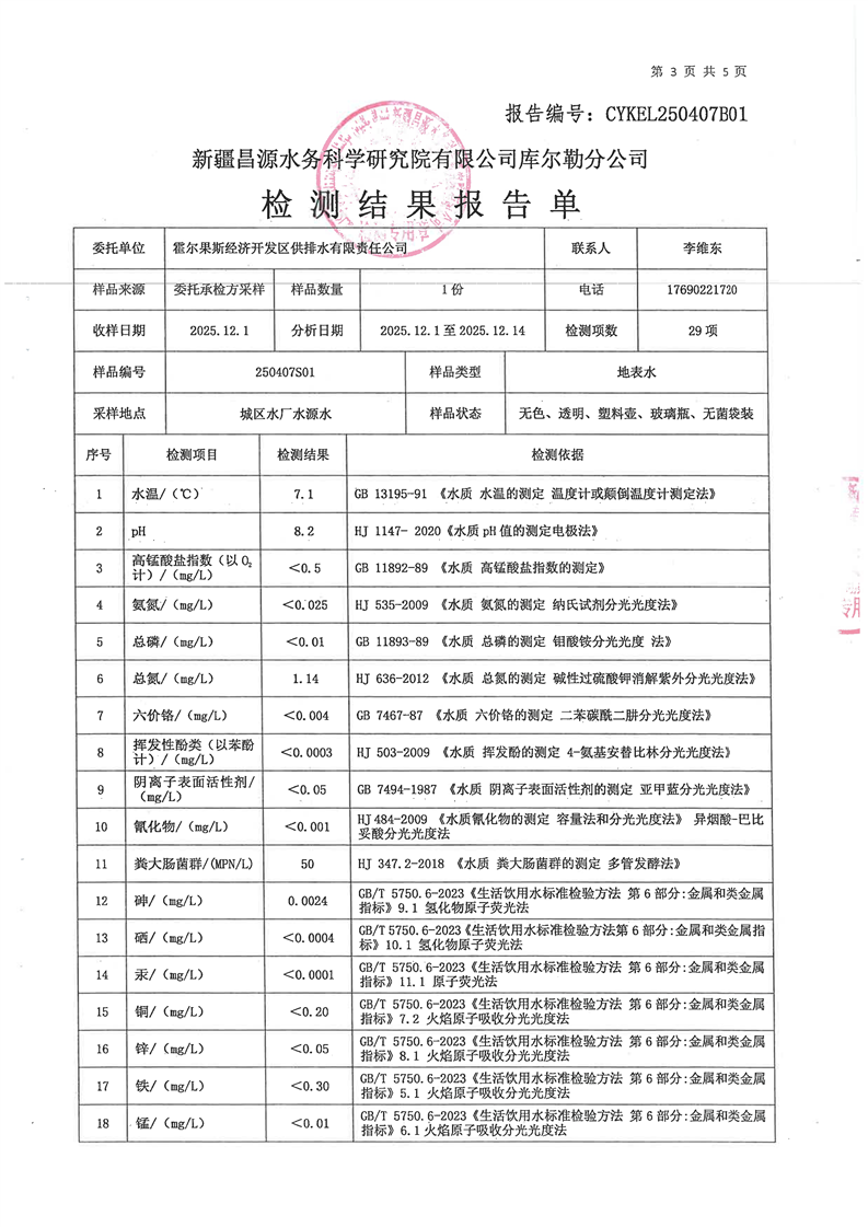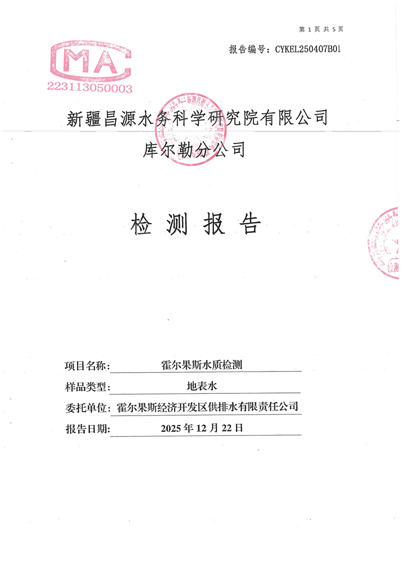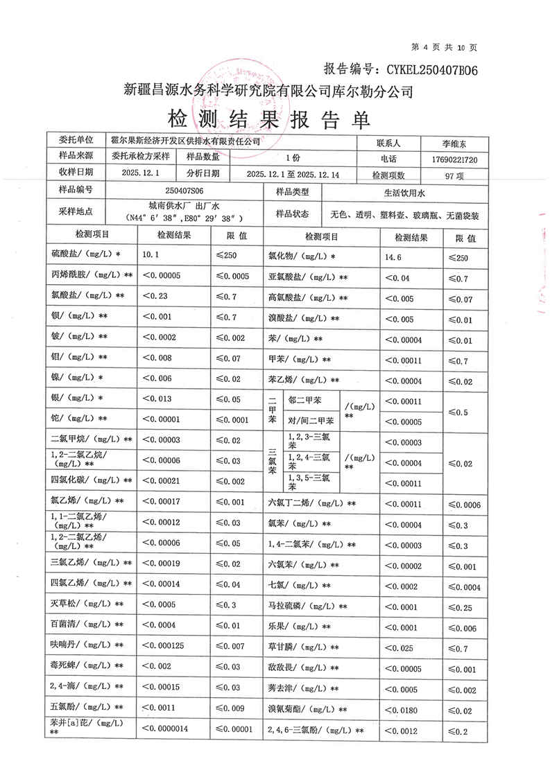 霍尔果斯市生活饮用水12月份水质检测报告