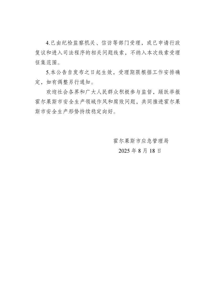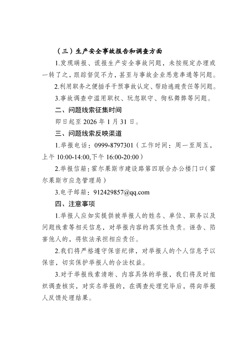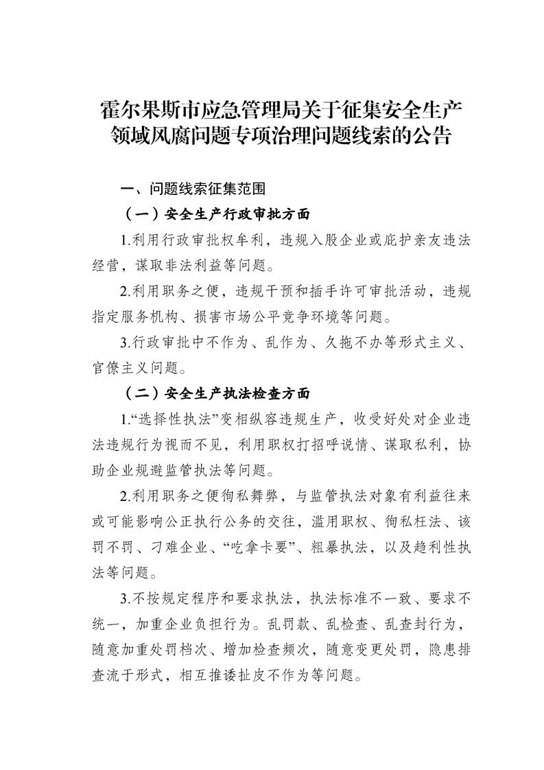 霍尔果斯市应急管理局关于征集安全生产领域风腐问题专项治理问题线索的公告