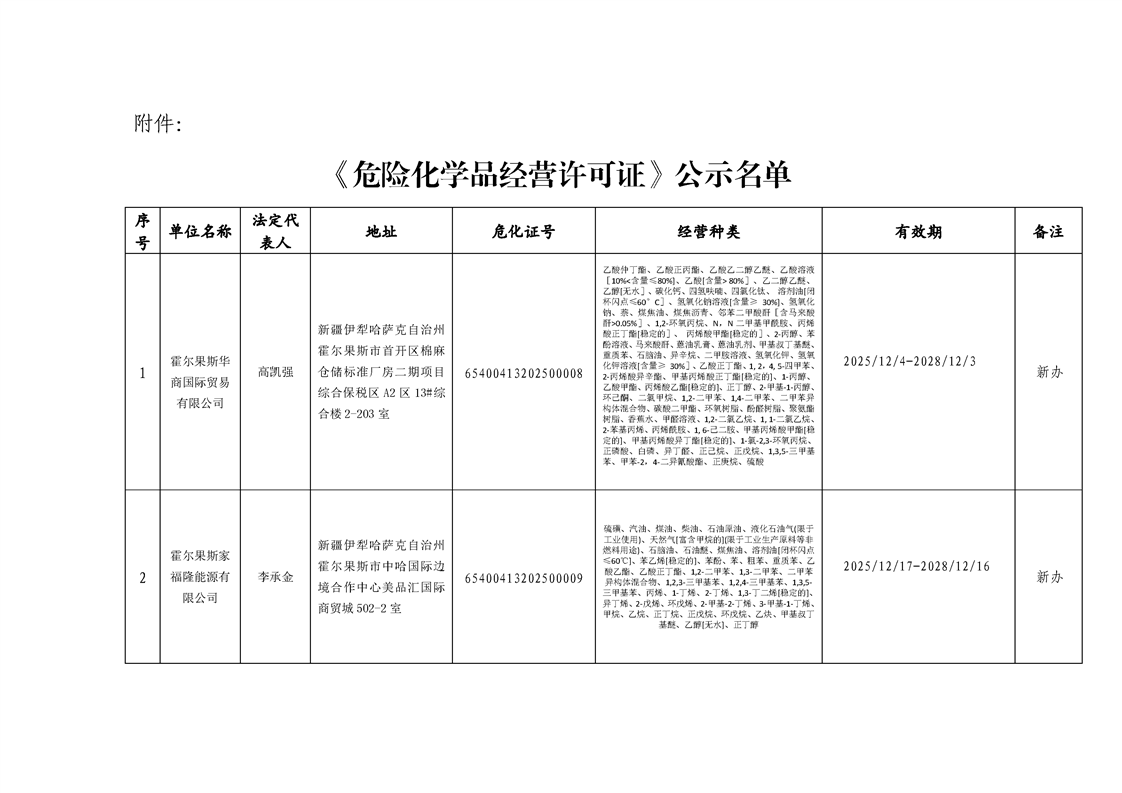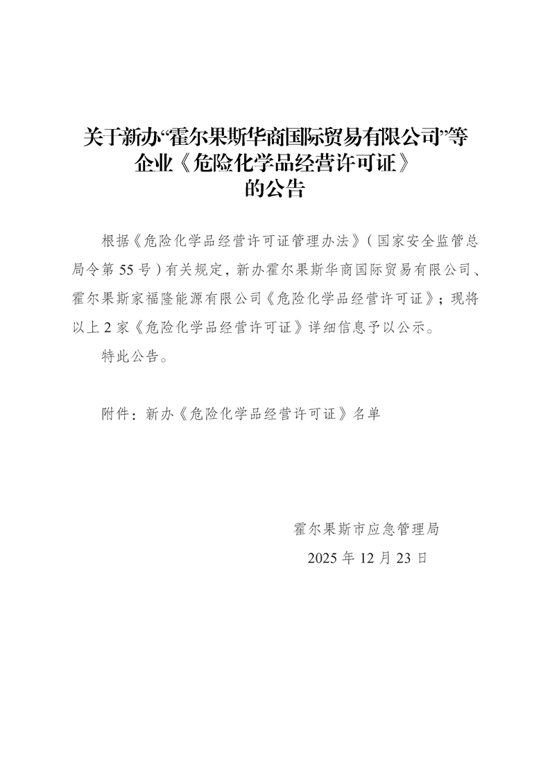 关于新办“霍尔果斯华商国际贸易有限公司”等企业《危险化学品经营许可证》的公告