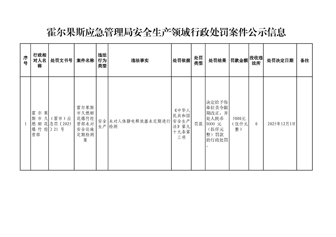 霍尔果斯市应急管理局安全生产领域行政处罚案件公示信息