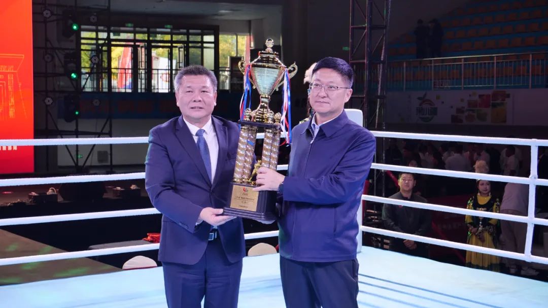 国家体育总局拳击跆拳道运动管理中心副主任、中国拳击协会主席陈立人向霍尔果斯市委副书记,市长皮履屏赠送“一带一路”国际拳击邀请赛大奖杯,希望霍尔果斯持续发挥自身优势,实现拳击体育项目的本士化发展,发挥体育在国际友好交流中的独特作用,深化共建“一带一路”国家间合作交流。