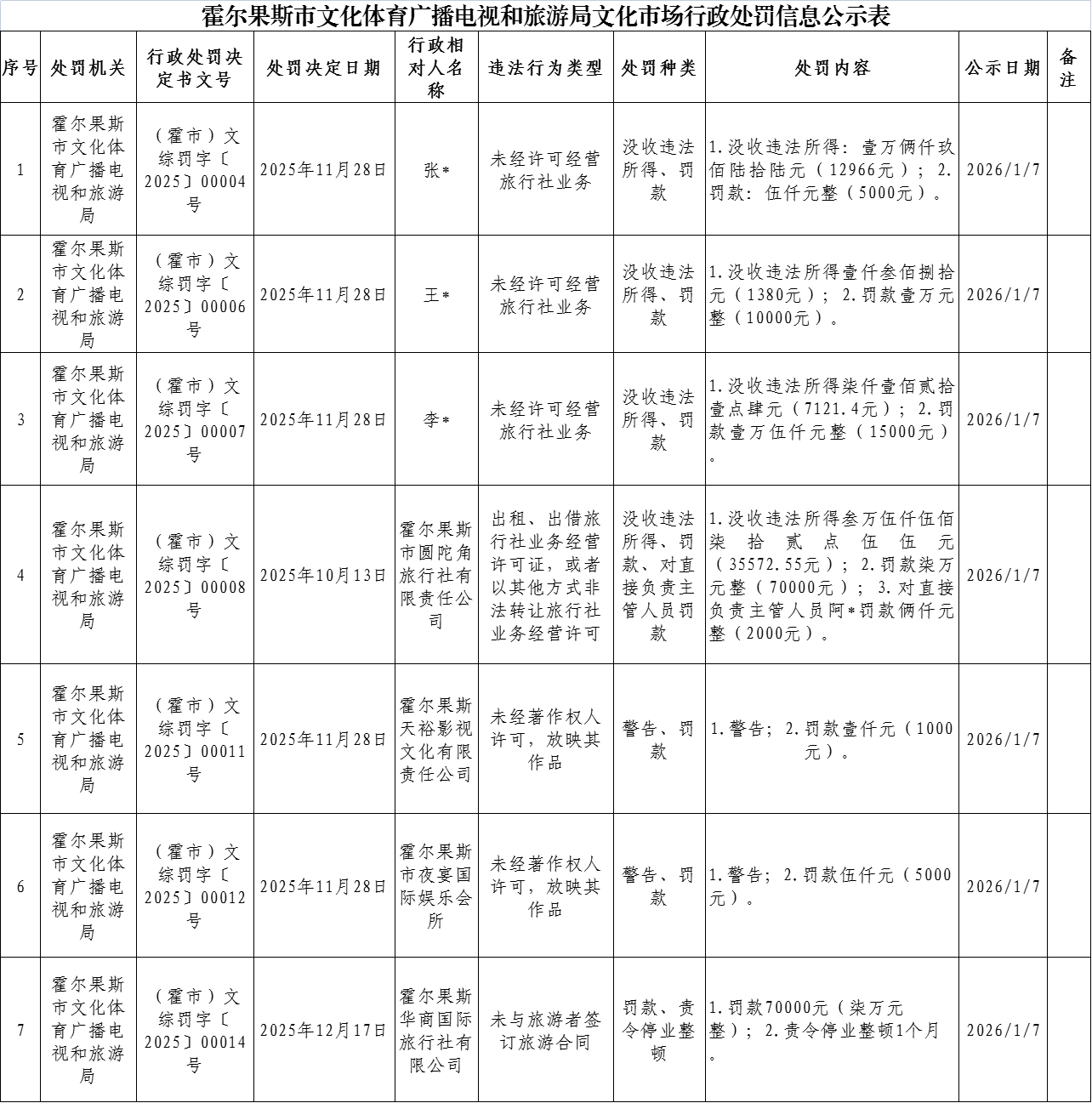 霍尔果斯市文化体育广播电视和旅游局文化市场行政处罚信息公示表