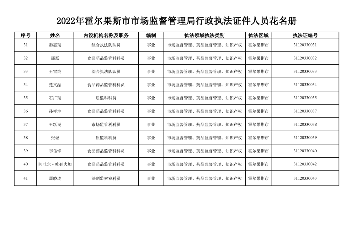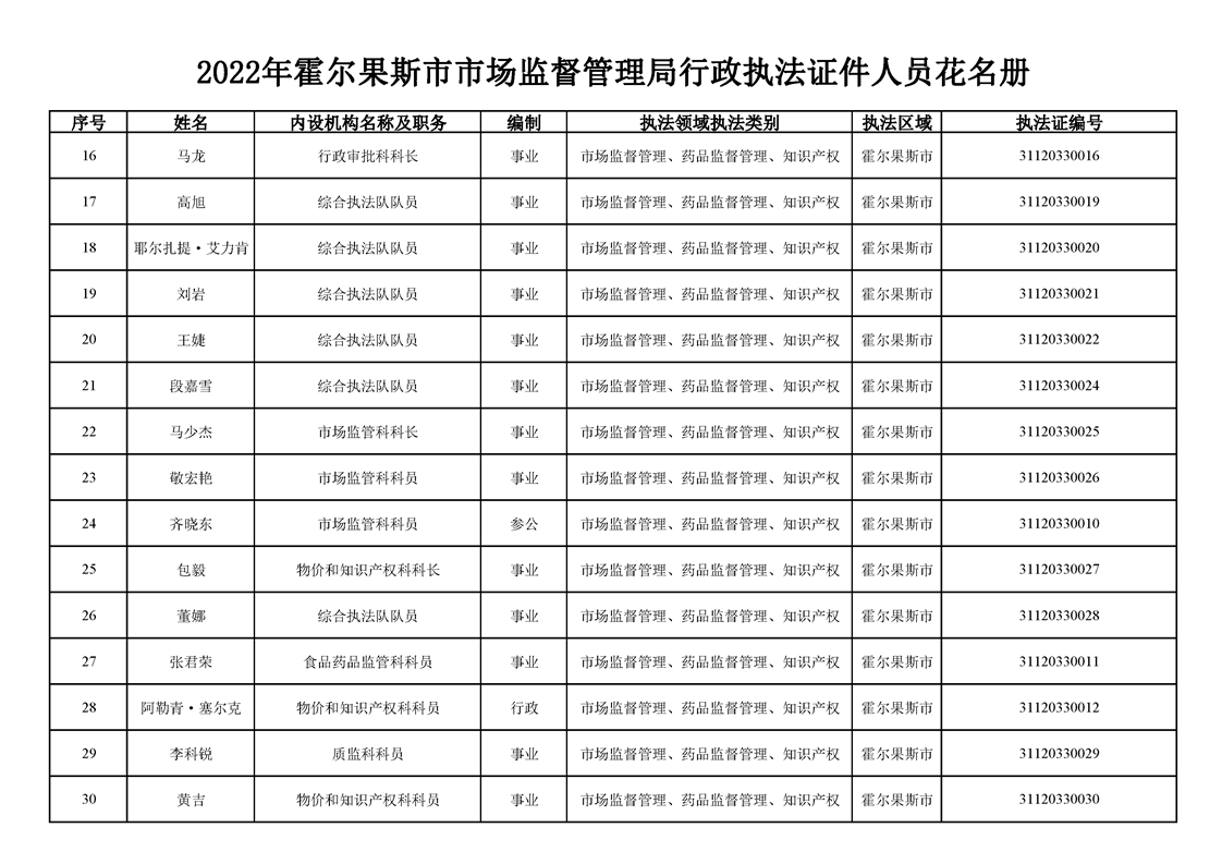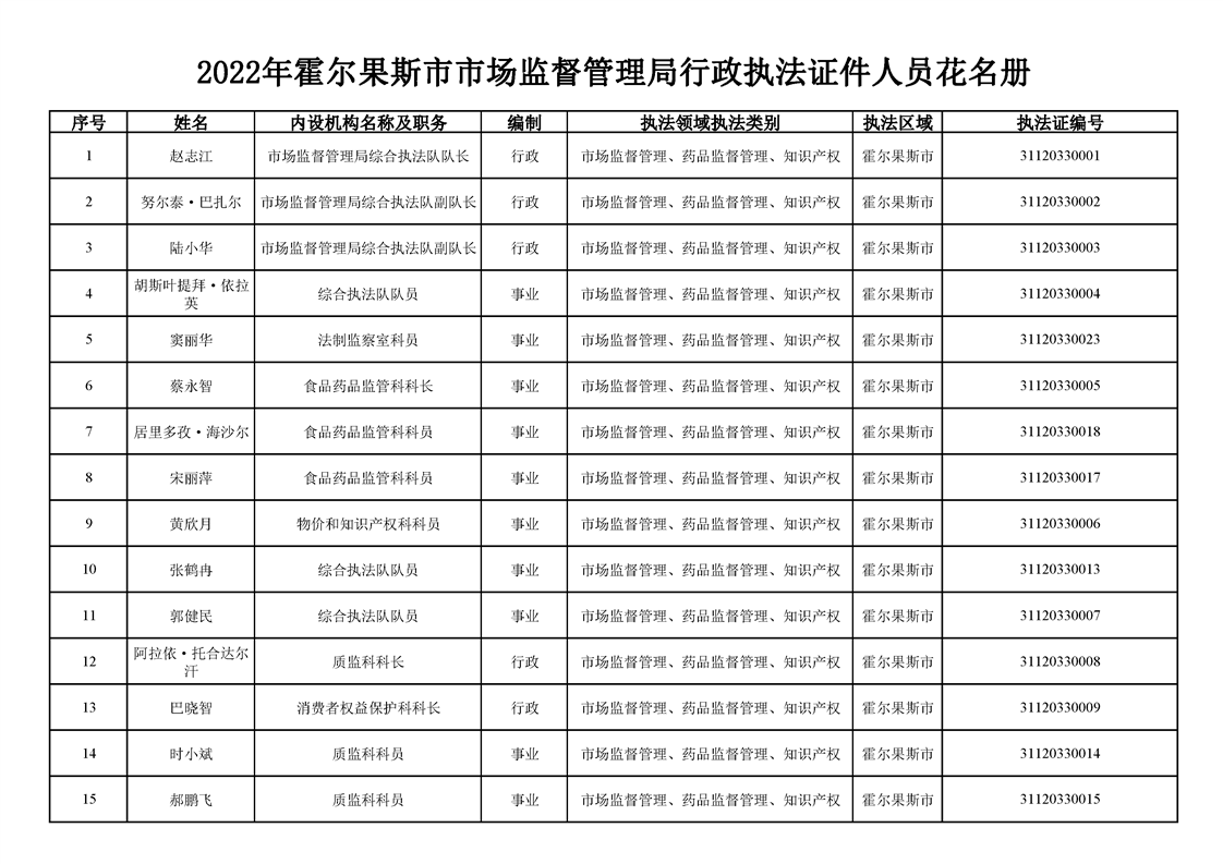 2022年霍尔果斯市市场监督管理局行政执法证件人员花名册