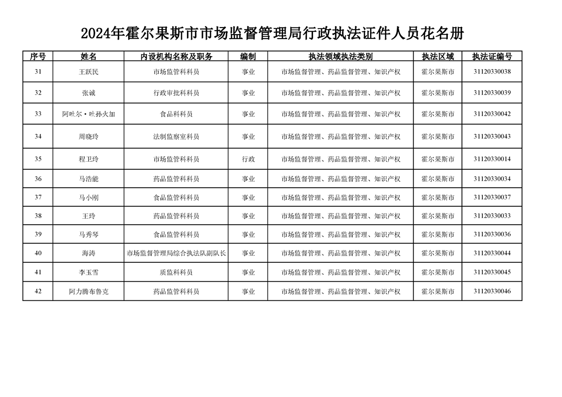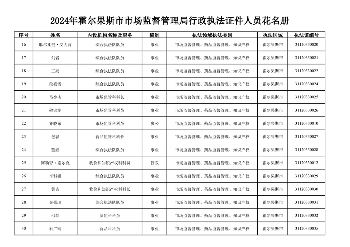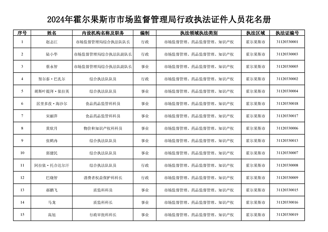 2024年霍尔果斯市市场监督管理局行政执法证件人员花名册