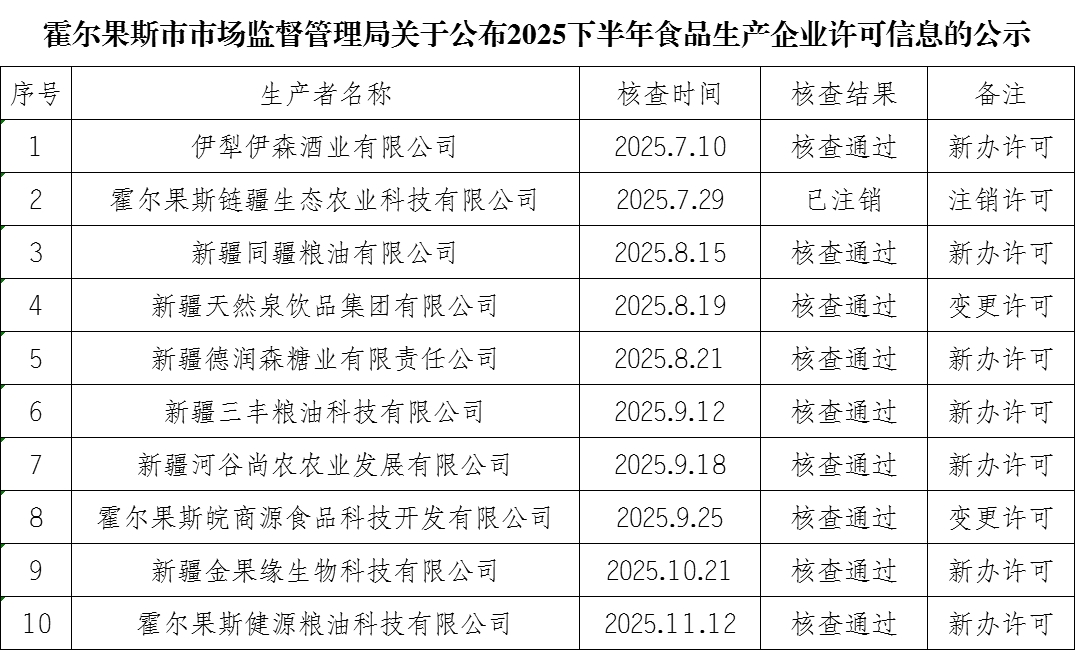 霍尔果斯市市场监督管理局关于公布2025下半年食品生产企业许可信息的公示
