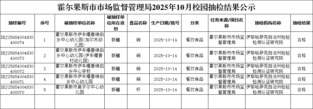霍尔果斯市市场监督管理局2025年10月校园抽检结果公示