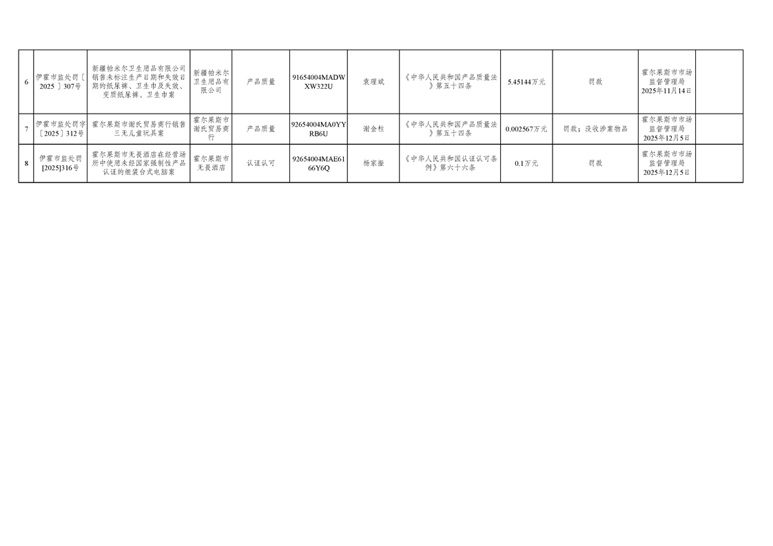2025年12月霍尔果斯市市场监督管理局行政处罚案件台账