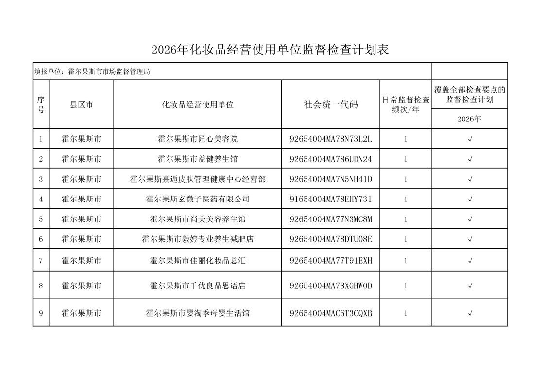2026年化妆品经营使用监督检查计划表