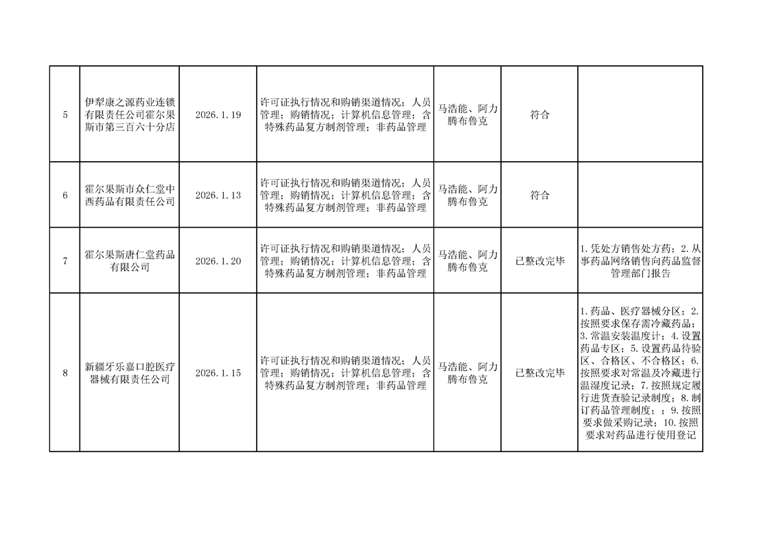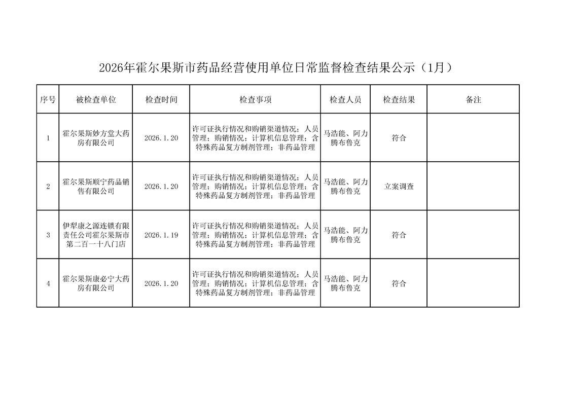 2026年霍尔果斯市药品经营使用单位日常监督检查结果公示(1月)