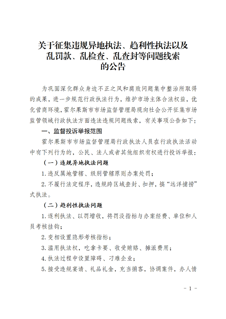 关于征集违规异地执法、趋利性执法以及乱罚款、乱检查、乱查封等问题线索的公告