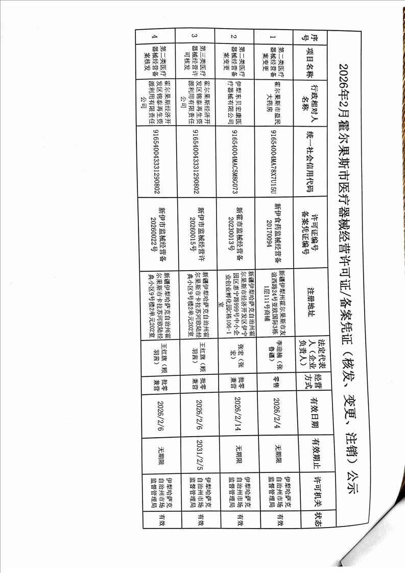 2026年2月霍尔果斯市医疗器械经营许可证备案凭证(核发、变更、注销)公示