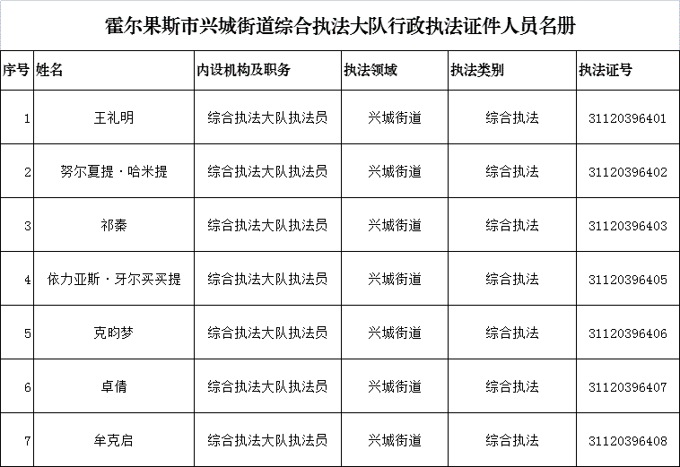 霍尔果斯市兴城街道综合执法大队行政执法证件人员名册