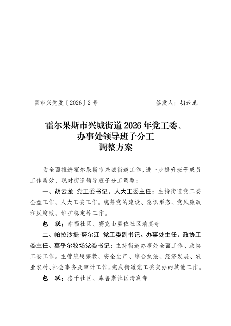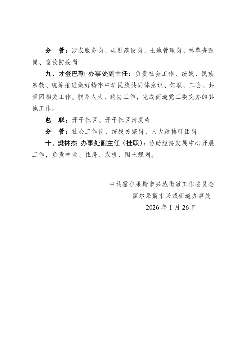 霍尔果斯市兴城街道2026年党工委、办事处领导班子分工调整方案