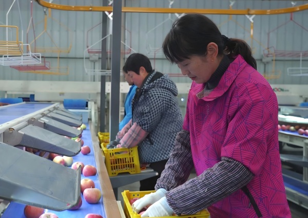 生产线上,一颗颗新鲜苹果经履带传送,依次完成清洗、消毒、风干等工序,再由工人进行精细分拣、装箱。这条智能化生产线月分拣能力1000余吨,每年可为本地苹果产业增值700余万元,经济效益显著。